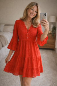 Estoy muy contenta con este vestido rojo. El color es precioso y en persona se ve aún más bonito que en las fotos. La tela es ligera y cómoda, ideal para llevar en casa o para salir a cenar en verano. Me gusta que no marca demasiado y que las mangas dan un toque elegante sin ser exageradas. Me siento segura y femenina cuando lo llevo puesto. Lo recomiendo totalmente.